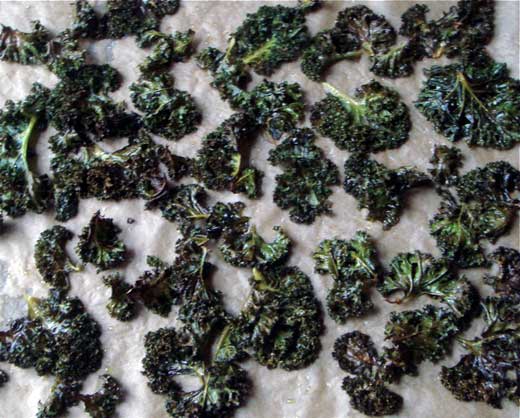 Preheat oven to 350 degrees. Place kale in a 9-by-13-inch baking dish, drizzle with olive oil, and sprinkle with salt. Bake for 15 minutes. Stir and return to oven for about 15 more minutes until kale is crisped. Store in a zipper-sealed bag for up to 2 days.