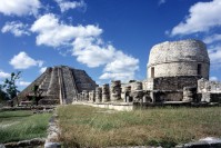 Post-classic (1220 – 1600 AD) period. Mayapan is one of the largest Maya archaeological sites on the Yucatan peninsula and is situated 24 miles southeast of the city of Merida. The site is surrounded by many cenotes, and by a fortified wall which enclosed more than 4000 buildings, covering an area of close to 1.5 square miles. Mayapan’s ancient glory remains evident in its buildings. Chichen Itza’s influence is seen in its main building, a smaller replica of El Castillo, the Kukulcan pyramid.
